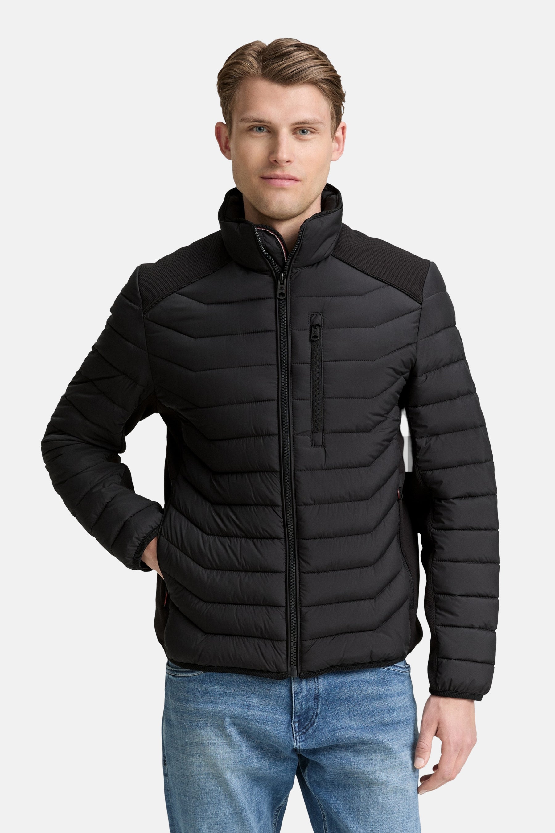 Description: * Gewatteerd hybride overgangsjack met opstaande kraag en logobadge op de arm. Gemaakt van bijzonder licht materiaal. Met steekzakken en een extra binnenzak voor je mobiele telefoon, sleutels of portemonnee.